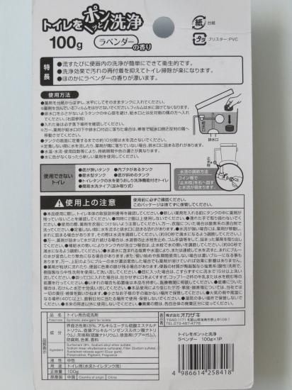 □成分:界面活性剤(8%、アルキルエテール硫酸エステルナトリウム、直鎖アルキルベンゼンスルホン酸ナトリウム)、充填剤(硫酸ナトリウム)、徐放剤(グアーガム)、防腐剤、色素、香料